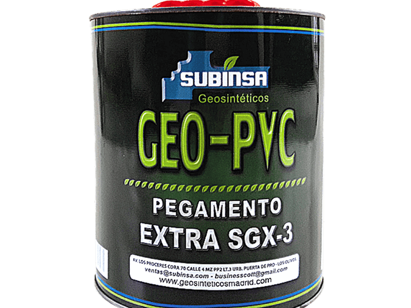 Es un pegamento multiuso a base de resinas, solventes y aditivos especiales utilizados para soldar los traslapes en las geomembranas y lonas de PVC. Pega tuberías de agua y desague hasta debajo del agua. También se adhiere a superficies metálicas, de concreto y cualquier producto que tenga el polímero PVC.
